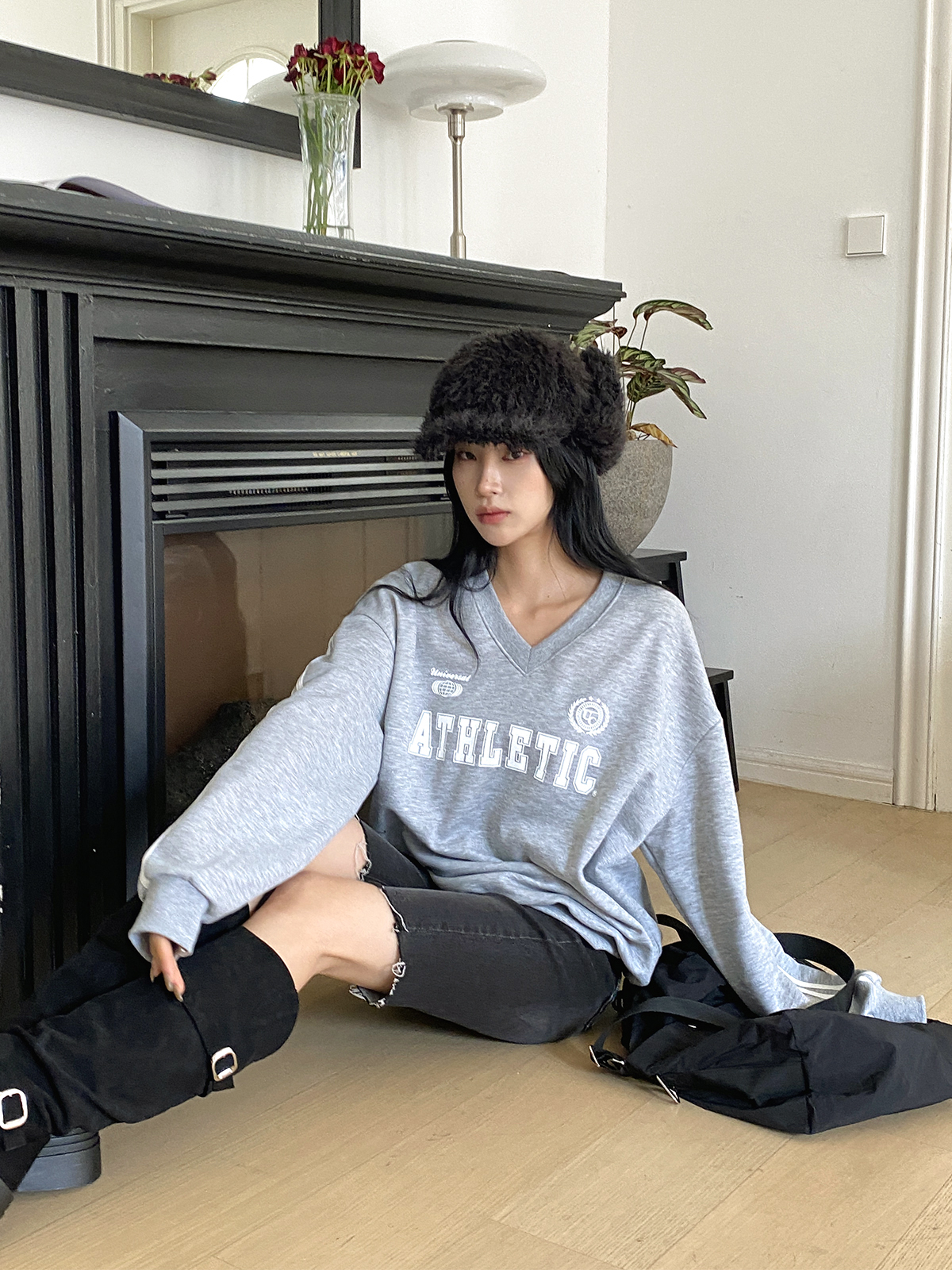 레터링 프린팅이 들어가있어 밋밋하지 않게 포인트가 되는 기모 브이넥 맨투맨 추천해드려요~!