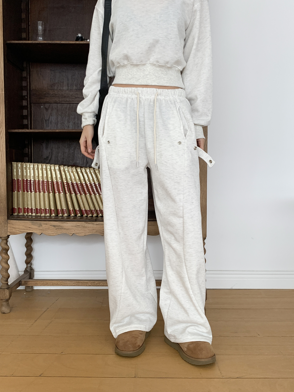사이드에 스냅 버튼이 있어 다양한 핏을 연출할 수 있는 밴딩 팬츠